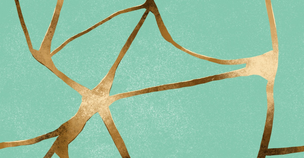 It reminds me of a Japanese art form known as Kintsugi. This entails a piece of broke pottery being made whole. Instead of using clear glue, it is repaired with gold or silver. The gold or silver is placed in the cracks of the broken pottery and in some cases, whole pieces are replaced with one of the two.